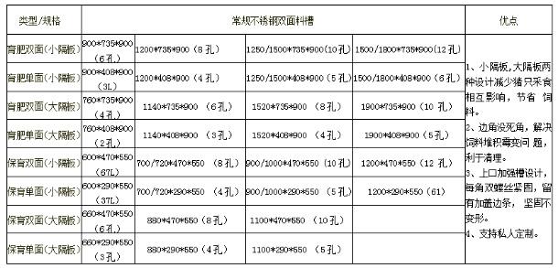 說到豬食槽,相信大家都知道它的用處,它是對於肉豬、母豬、種豬等不同品種豬的一個喂養機械,也是定備品。當然不鏽鋼式的食槽是當下越為受大家青睞的產品,它是由不透鋼材質製成的,具有耐腐蝕性、堅硬、長期耐使用等特點,有多個位置,豬用雙麵料槽,利用率比較大。它可以根據養豬業的場地大小、生產水平等當麵來定製的。